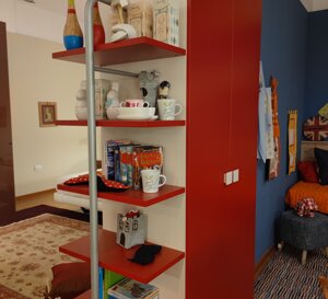 libreria a giorno in appoggio su basamento e boiserie angolare in legno. Dimensioni Libreria: cm.98x30x131h.