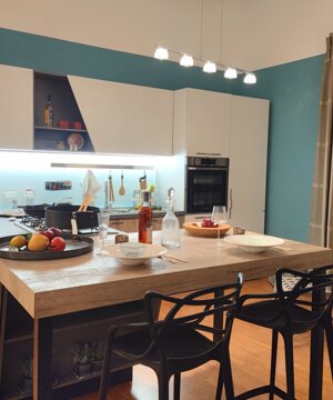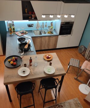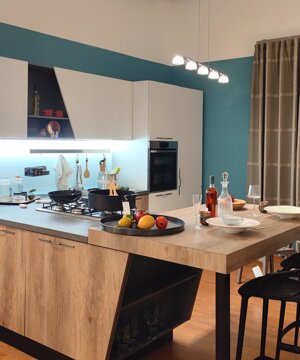 Cucina con penisola, anta in laminato, completa di elettrodomestici Samsung: piano cottura 5 fuochi, forno dual Cook, lavastoviglie a scomparsa, frigo combinato. schienale in vetro luminoso magnetico. Dimensioni composizione: 360x273x160 cm.