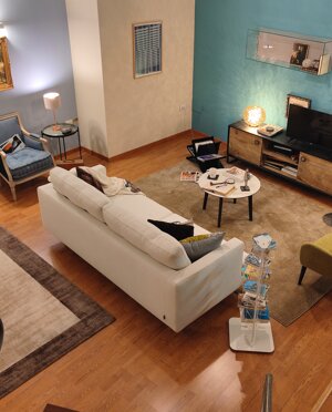 Salotto composto da Divano 3 posti rivestito in tessuto completamente sfoderatile, antibatterico, lavabile in acqua.Dimensioni: cm.210x98.Poltrona piedi in legno noce scuro rivestita con tessuto Bouclé