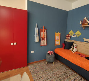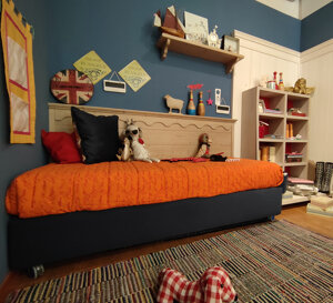 Camera per ragazzi composta da: letto singolo su ruote gommate morbide rivestito in tessuto sfoderatile completo di rete e materasso. Dimensioni: cm.190x80